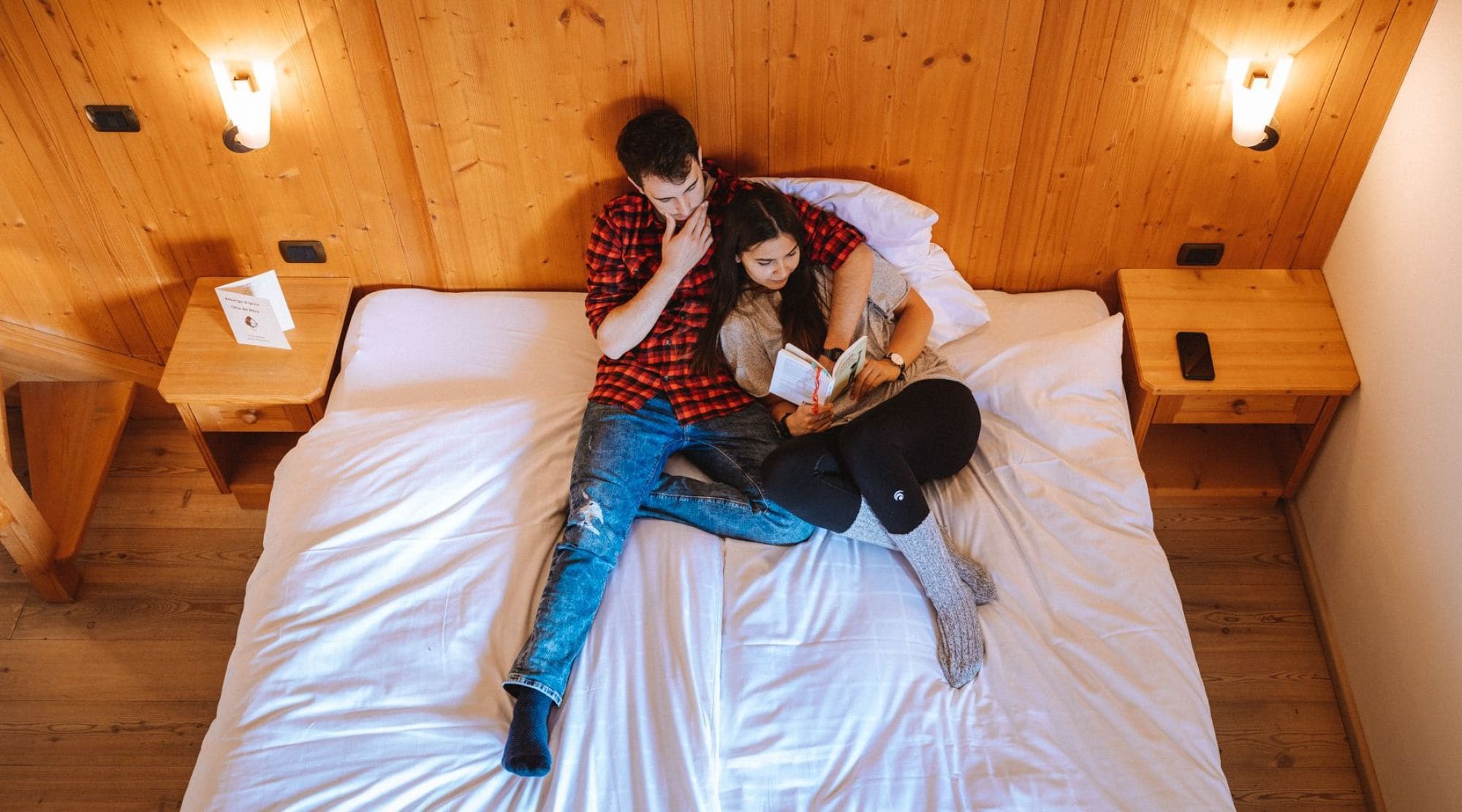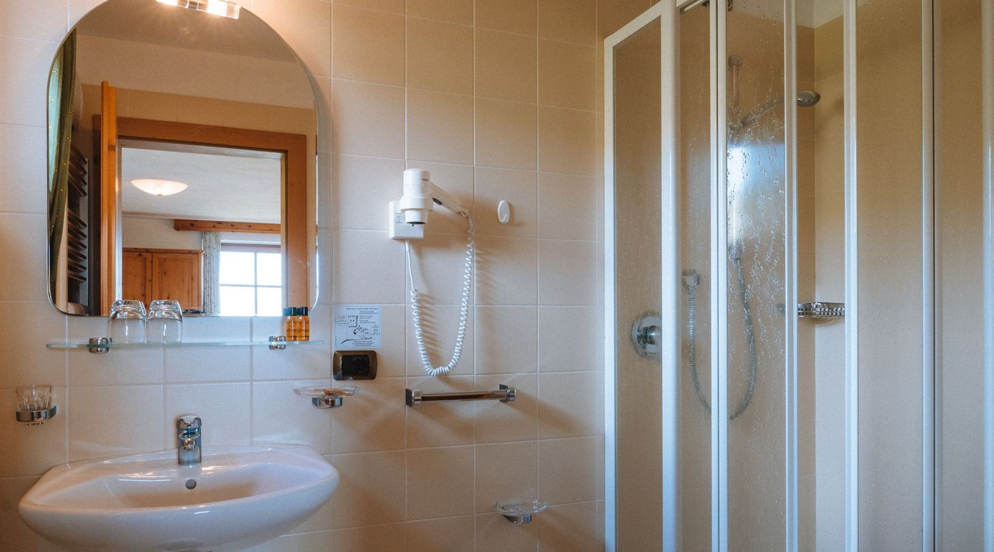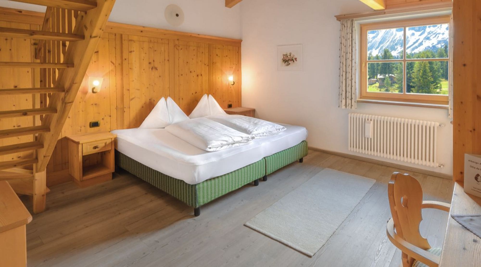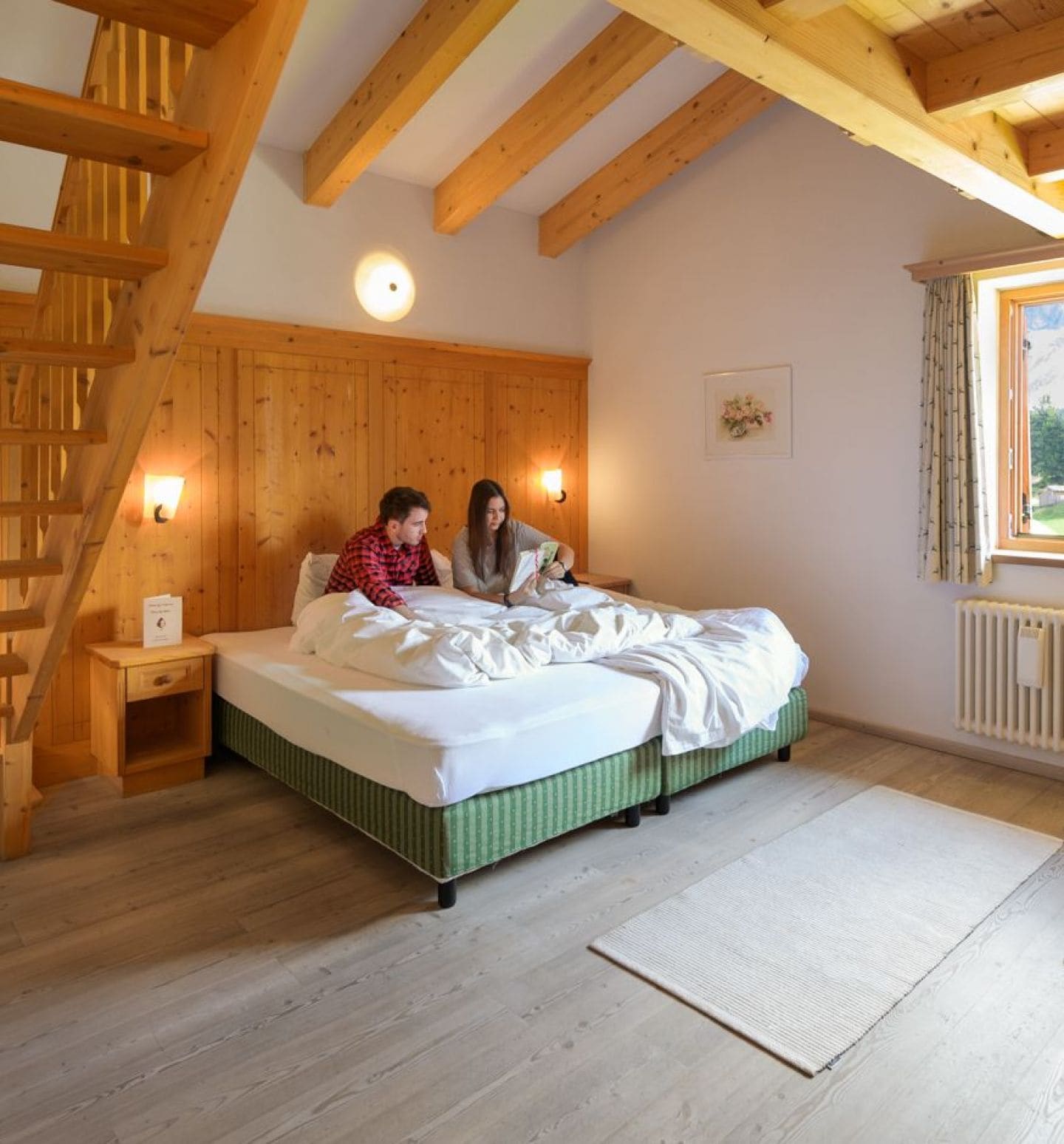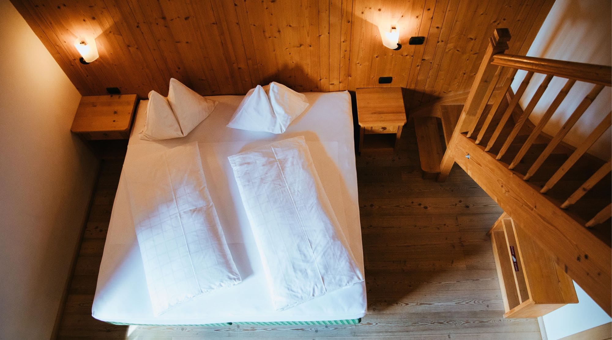 Accogliente camera familiare di circa 28 m² arredata con legno di pino cembro. Oltre al letto matrimoniale dispone di uno splendido soppalco mansardato in legno particolarmente apprezzato dai bambini, dove si trovano due letti singoli. In alcune camere è disponibile, in aggiunta, un comodo divano-letto per una persona oppure un letto a castello. Dispone di TV a schermo piatto e bagno completo con doccia e bidet.